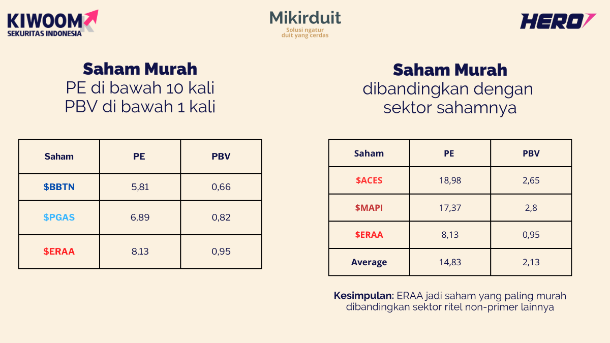 Untuk cara tahu sebuah saham cukup murah di sektornya bisa dibandingkan dengan PE atau PBV yang paling rendah dibandingkan dengan saham lainnya. Hal itu menandakan saham sudah cukup murah.