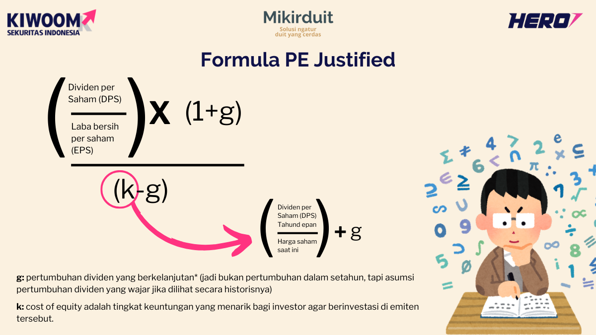 Formula PE Justified ini menggunakan beberapa indikator seperti perkiraan dividen per saham, perkiraan laba bersih per saham dalam setahun ke depan, rata-rata pertumbuhan dividen yang wajar, cost of Equity (Tingkat pengembalian yang diharapkan oleh pemegang saham) dalam hal ini kami menggunakan rumus Dividend Capitalization Model yang rumusnya dividen per saham, harga saham terkini, dan tingkat pertumbuhan dividen yang wajar.