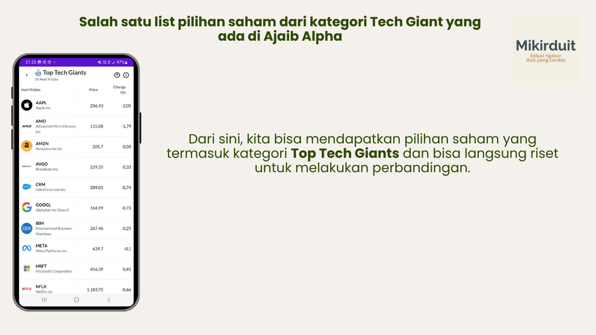 Dalam memilih US Stock, kamu bisa melakukan step pertama, yakni screening saham yang dianggap apple to apple lebih mudah dengan aplikasi Ajaib Alpha. Dalam aplikasi Ajaib Alpha, kamu bisa memilih saham-saham yang cukup apple to apple untuk dibandingkan dari 15 kategori ini.