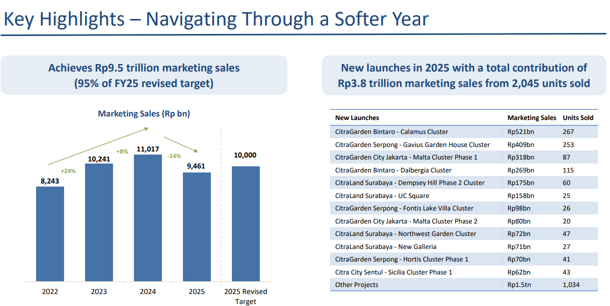 Dari sisi kontribusi proyek baru, sepanjang 2025 CTRA meluncurkan sejumlah proyek yang secara total menyumbang marketing sales sebesar Rp3,8 triliun dari penjualan 2.045 unit.