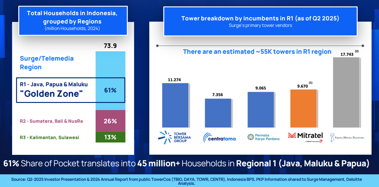 Dari sisi infrastruktur, estimasi menunjukkan terdapat sekitar 55 ribu tower di Region-1 (per Q2 2025), yang tersebar di berbagai tower provider besar seperti Tower Bersama Group (TBIG), Centratama (CENT), Permata Karya Perdana, Mitratel (MTEL), dan Sarana Menara Nusantara (TOWR).