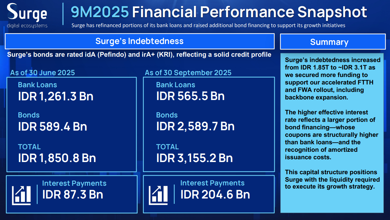 Berlanjut ke kinerja keuangan, hingga akhir September 2025 struktur pendanaan WIFI menunjukkan peningkatan signifikan seiring percepatan ekspansi FTTH dan FWA. Total liabilitas berbunga naik dari Rp1,85 triliun per 30 Juni 2025 menjadi Rp3,16 triliun per 30 September 2025.