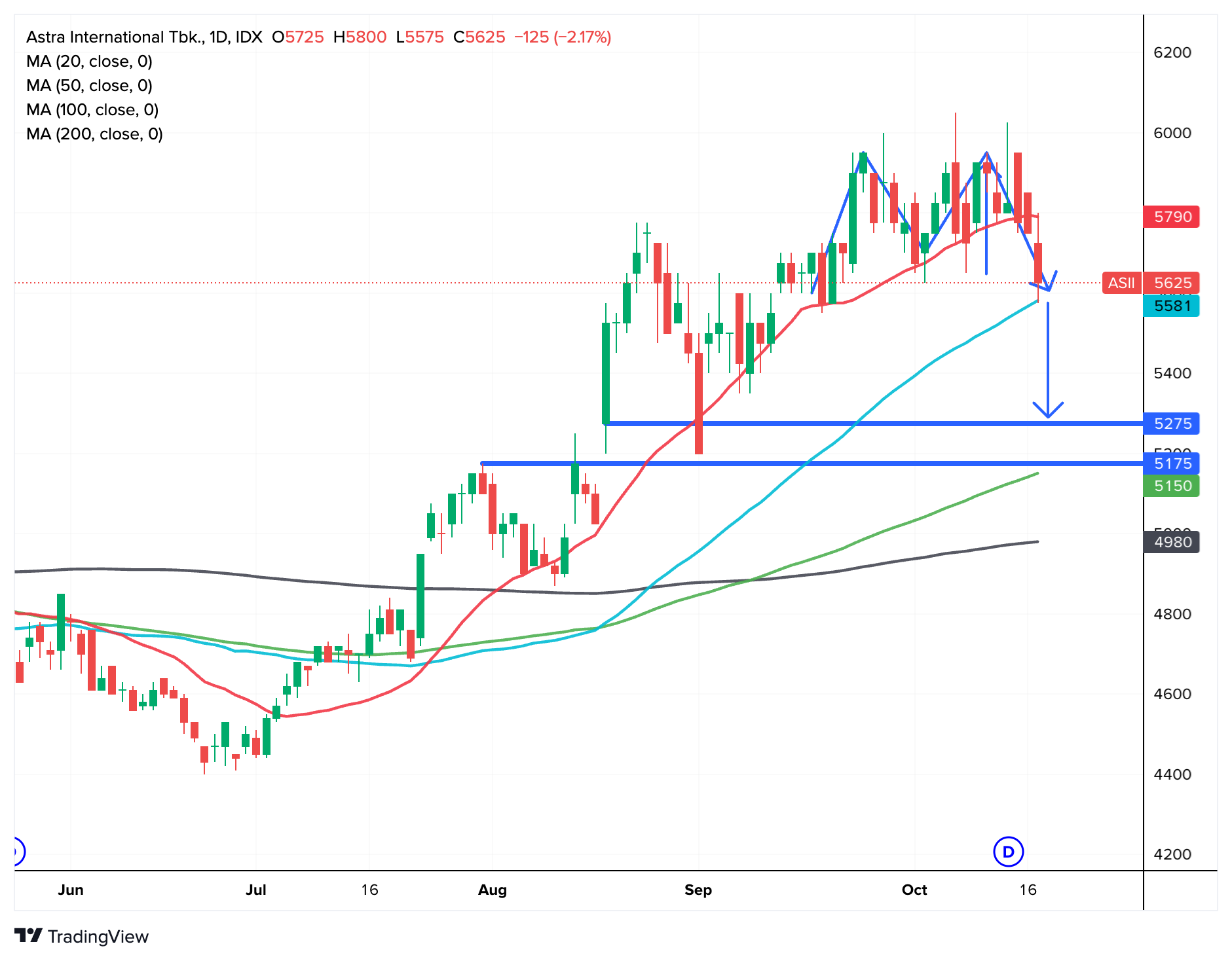 Kami melihat sampai akhir Jumat lalu (17/10/2025) saham ASII mengalami koreksi signifikan menembus support trenline MA20 daily. Ada pattern distribusi yang terbentuk yaitu double top. Jika ini terkonfirmasi lebih lanjut, artinya akan ada risiko penurunan lagi, paling tidak mencapai target pattern ke 5.275.