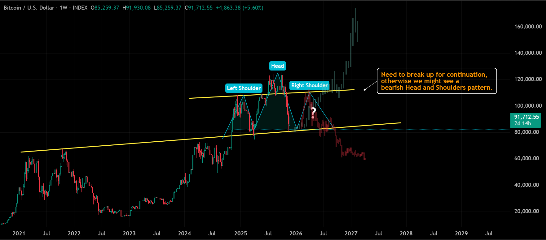 Namun, untuk jangka menengah, risiko distribusi tetap besar. Struktur harga menunjukkan tanda pola head and shoulder, dan secara historis puncak siklus halving kemungkinan sudah tercapai.