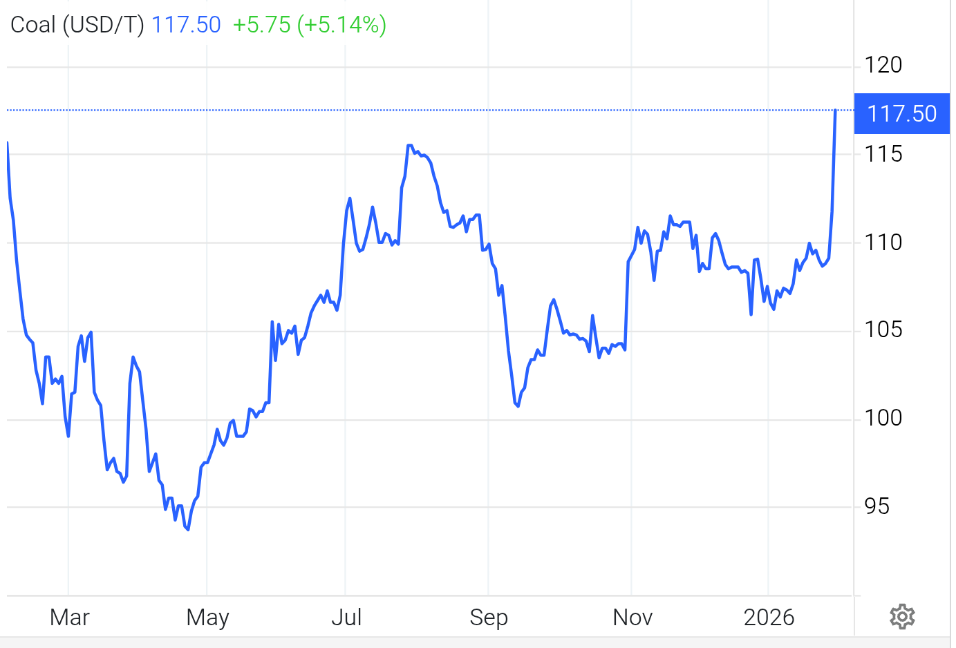Merespon prospek pengurangan produksi dari RI, harga batu bara dunia (ICE Newcastle) terpantau terbang 5 persen pada akhir pekan lalu, Jumat (30/1/2026) ke posisi US$ 117 per ton, mengakumulasi kekuatan sejak awal tahun sebesar 11 persen, sekaligus menandai posisi tertinggi sejak Agustus 2025.