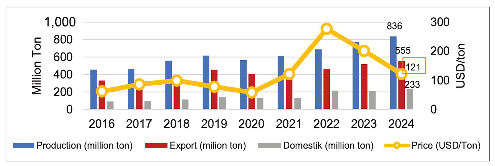 Untuk lebih jelasnya, data di bawah ini menunjukkan perkembangan produksi dan ekspor batu bara Indonesia yang cenderung selalu naik dalam 10 tahun terakhir. Sampai pada 2024 terlihat produksi dan ekspor batu bara mencapai rekor-nya :
