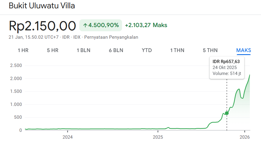 Harga saham BUVA baru-baru ini melejit ke posisi Rp2.150 per saham pada 21 Januari 2026, menandai posisi tertinggi sepanjang masa. Dalam setahun terakhir, saham emiten Happy Hapsoro ini sudah terbang lebih dari 4000 persen.