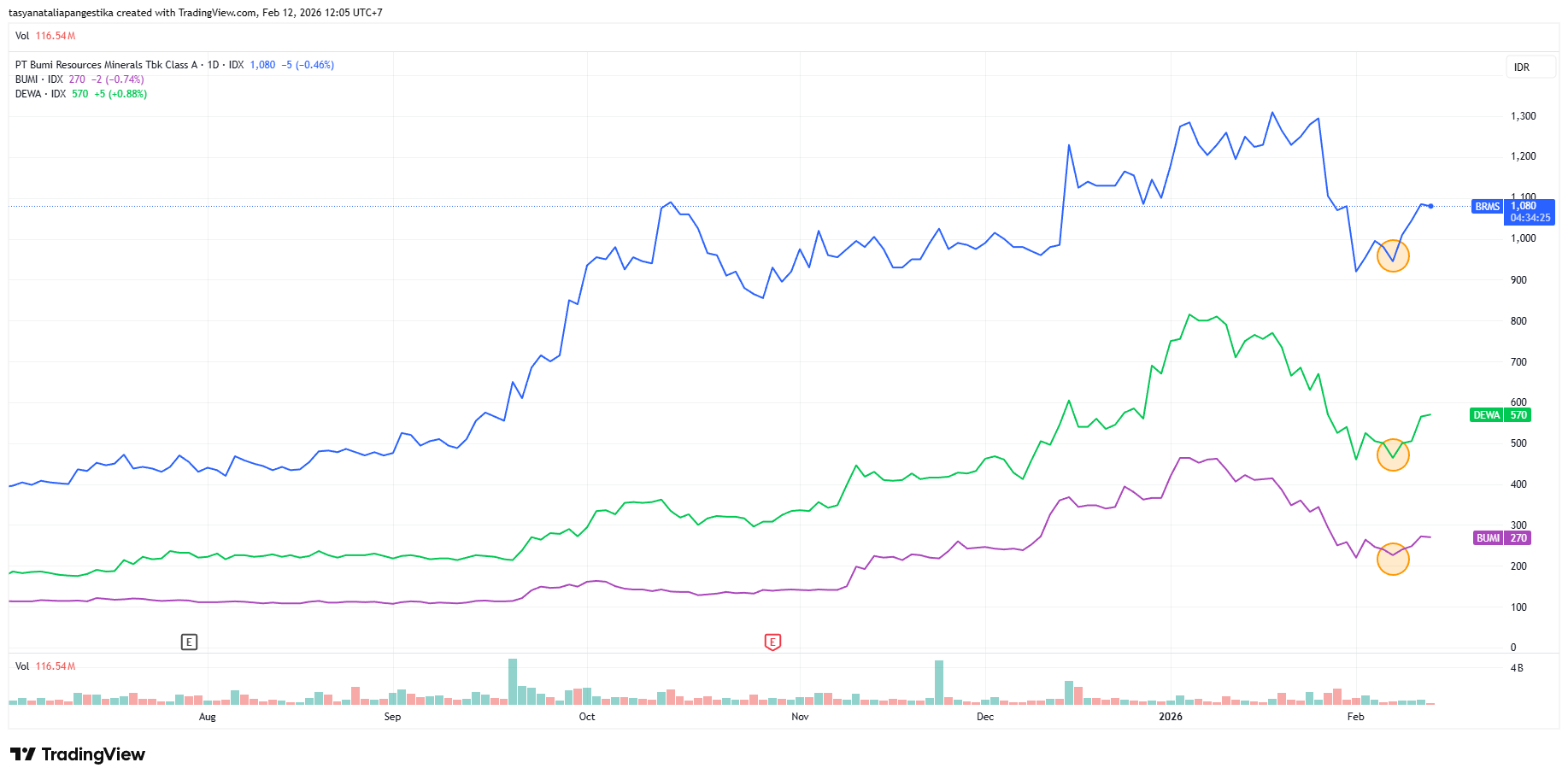 Hingga harga penutupan perdagangan Kamis, 12 Februari 2026, penguatannya pun terbilang signifikan. Saham BUMI dan DEWA masing-masing sudah melonjak lebih dari 40 persen dari level terendahnya.
