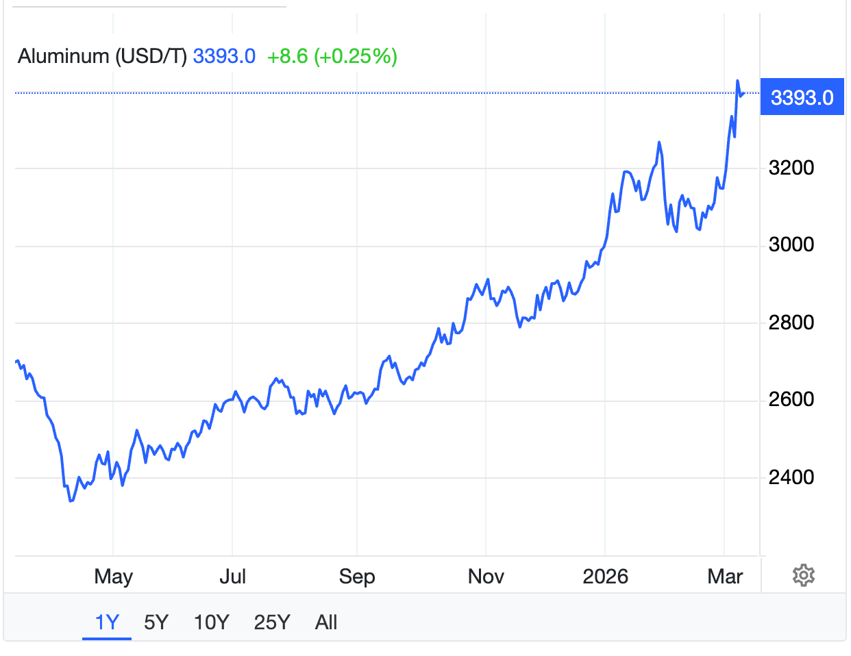 Harga aluminium masih berada dalam tren kenaikan yang solid. Dalam setahun terakhir, harganya telah naik lebih dari 25 persen hingga mencapai sekitar US$3.393 per ton per 10 Maret 2026, mendekati level tertinggi dalam empat tahun terakhir.