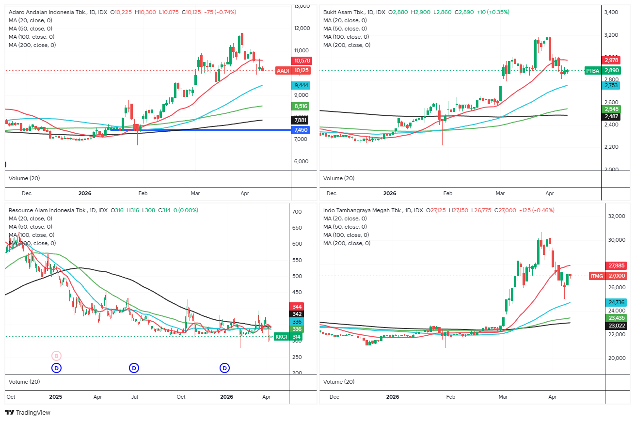 Seiring dengan gerak harga batu bara yang sedang terkoreksi, gerak harga saham AADI, ITMG, dan PTBA juga sama. Meski begitu, secara tren masih dalam kenaikan.