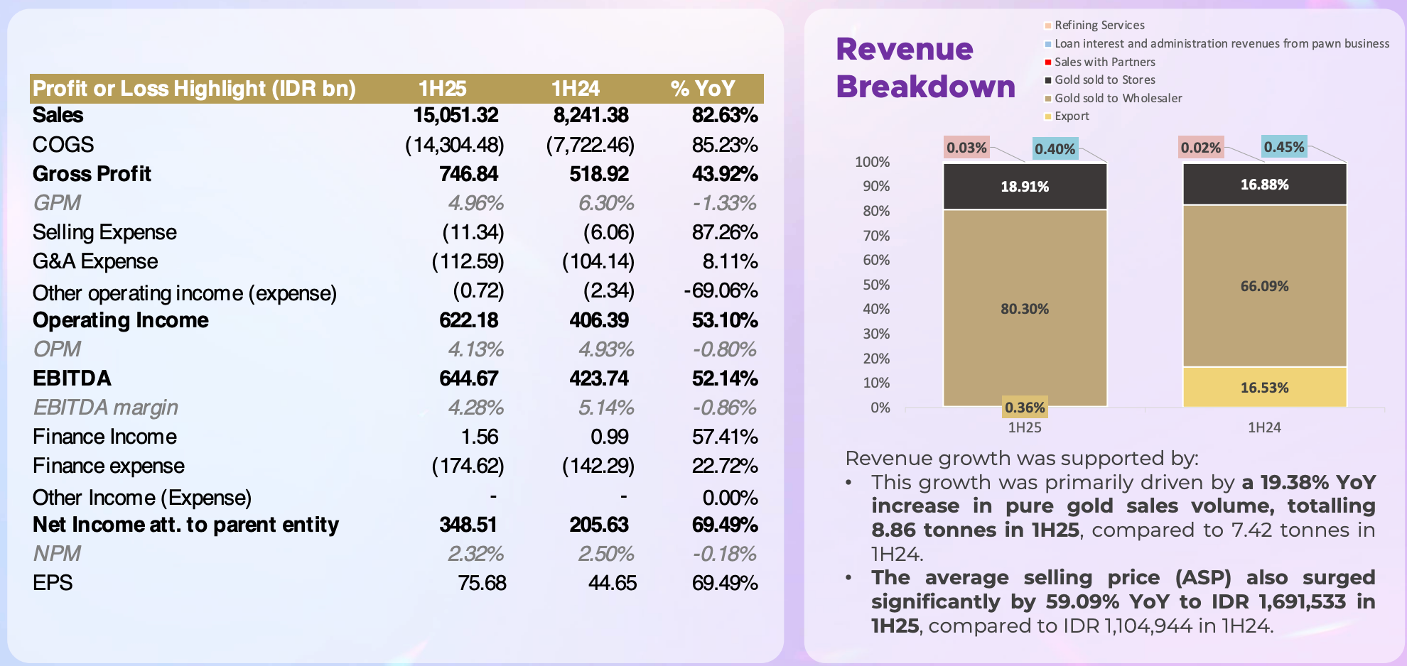Pencapaian ini utamanya didorong oleh kenaikan volume penjualan emas murni sebesar 19,38 persen secara tahunan, dari 7,42 ton di semester I-2024 menjadi 8,86 ton di semester I-2025. Dari total penjualan, distribusi ke Bullion Bank Indonesia menyumbang sekitar 51,5 persen.