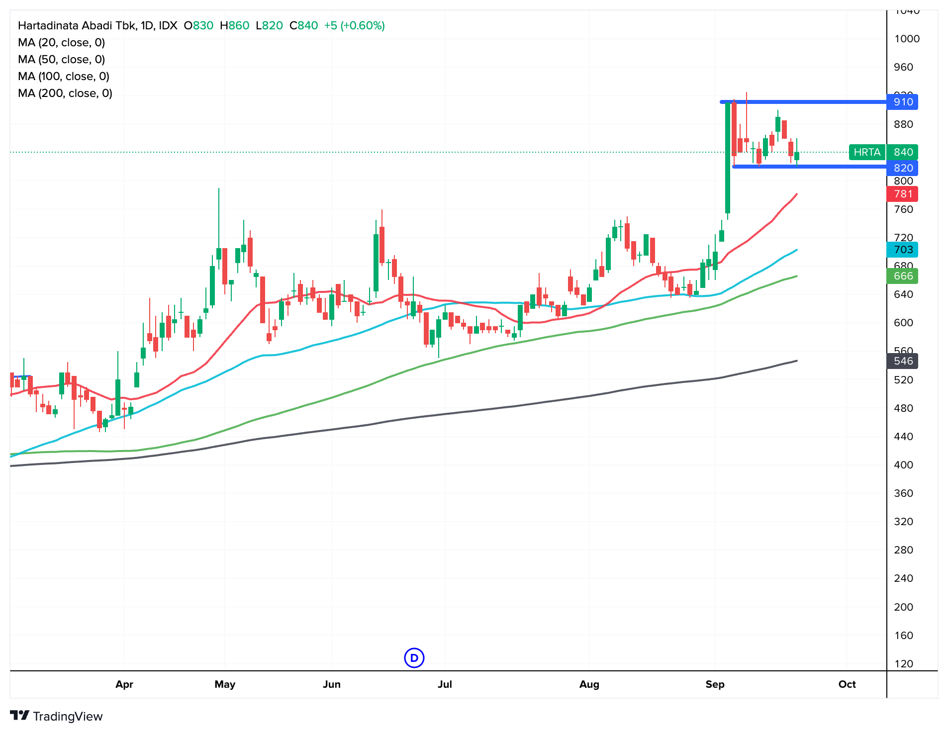 Saham HRTA menurut kami, masih dalam tren harga yang menarik alias masih uptrend.