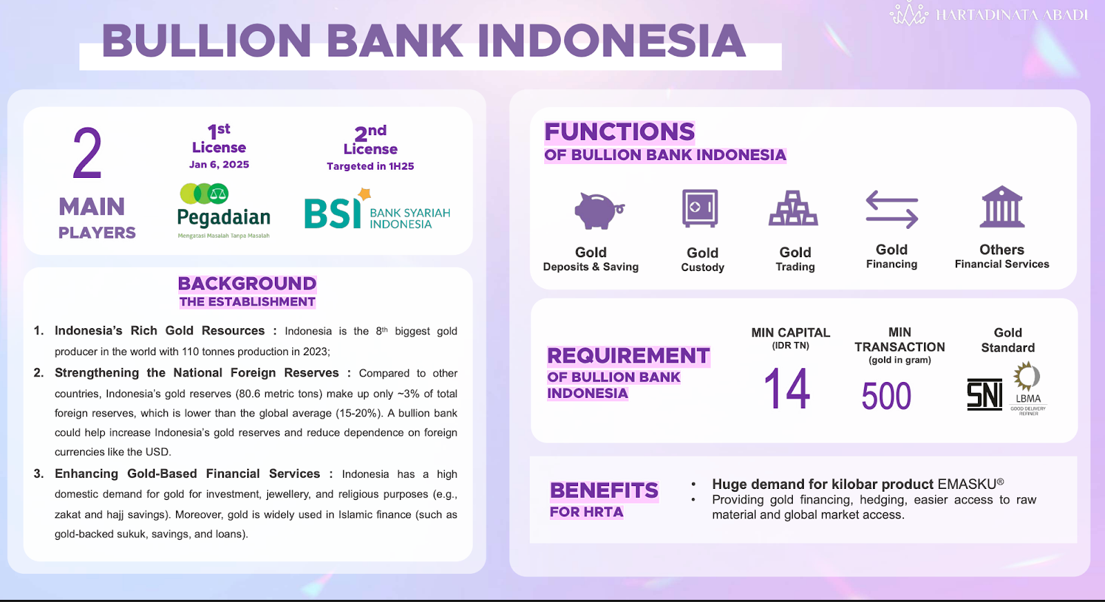 Pertama, HRTA berpartisipasi dalam ekosistem Bullion Bank Indonesia. Langkah ini memungkinkan HRTA memperluas distribusi emas batangan sekaligus meningkatkan kontribusi ke dalam sistem perdagangan emas domestik.