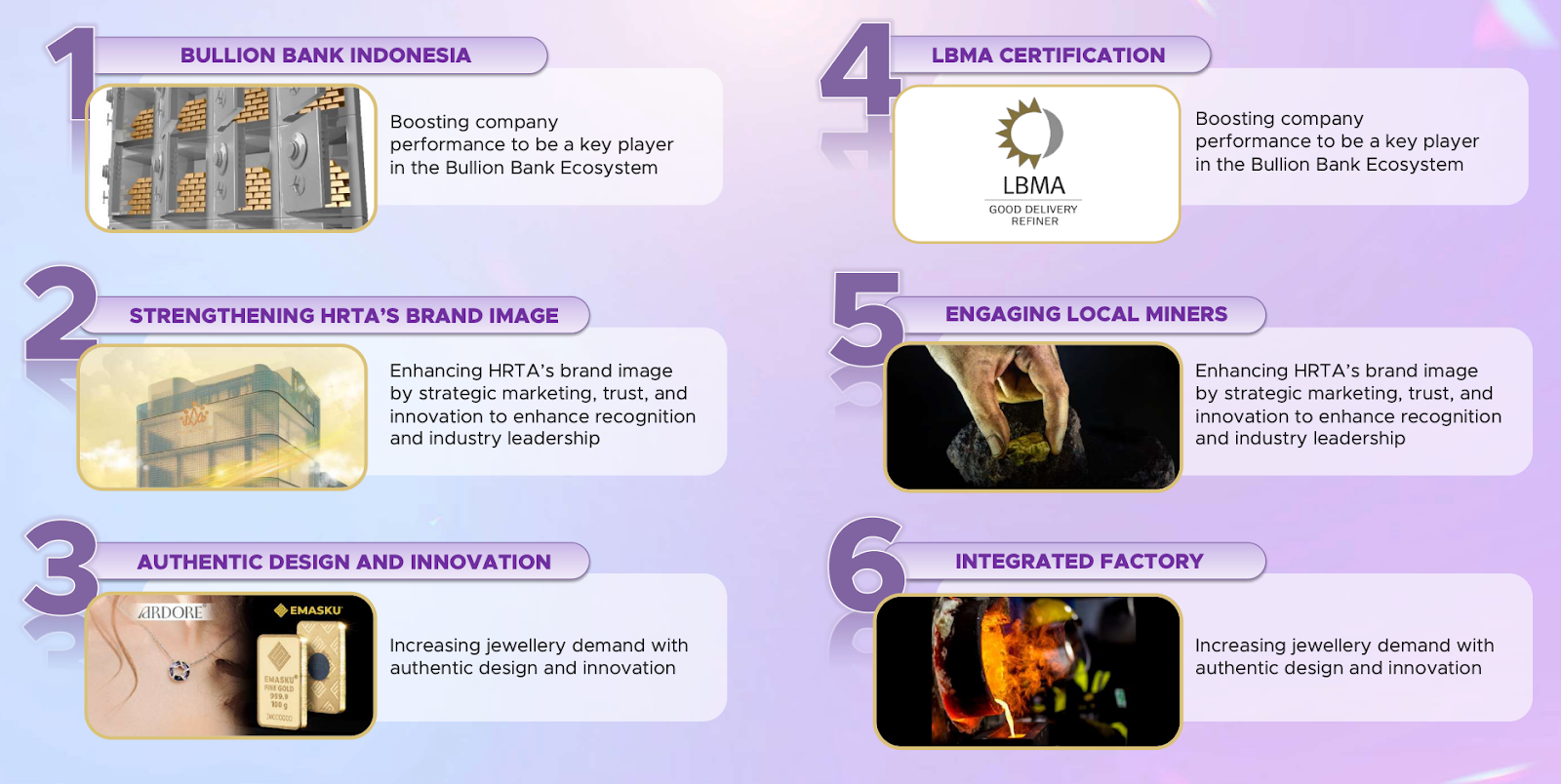 Kami mencatat ada enam strategi utama yang dijalankan HRTA untuk memperkuat posisinya di industri emas nasional.