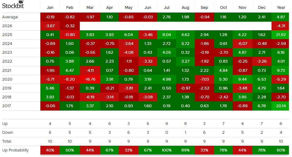 Untuk Ramadan 2026 yang dimulai 19 Februari, periode yang paling relevan adalah Februari–Maret. Secara historis, Februari cenderung kurang kuat, namun Maret memiliki probabilitas kenaikan yang jauh lebih tinggi.