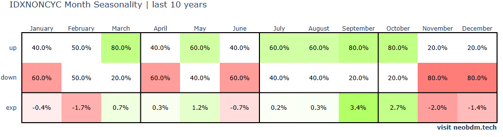 Berdasarkan data NeoBDM yang kami tarik per 18 Februari 2026, seasonality IDXNONCYC (consumer non-cyclical) selama 10 tahun terakhir dan disesuaikan dengan pergeseran Ramadan yang maju setiap tahun, terlihat bahwa efek musiman sektor konsumsi relatif lebih konsisten. Berikut rincian musim lebaran dalam satu dekade: