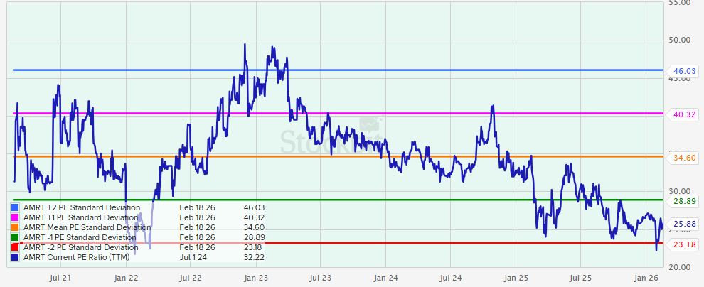 Sementara itu, dari sisi valuasi, saham AMRT saat ini berada pada level yang relatif menarik dibandingkan rata-rata historisnya maupun dibandingkan pertumbuhan labanya. Terlihat dari PE Current di 25,88 kali, berada di bawah -1 standar deviasi PE Band lima tahun dan jauh dari rata-rata PE di 34.60 kali.