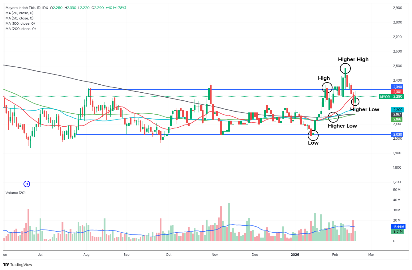 Secara teknikal, kami juga menilai gerak saham MYOR mulai ciamik, terlihat dari higher low yang terbentuk, menunjukkan tren harga sudah mulai membaik dan ada potensi perubahan tren dari sideways menuju naik.