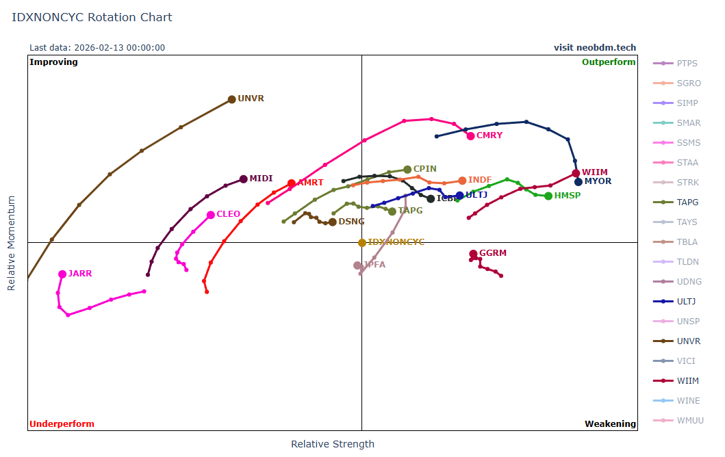 Menarik data dari NeoBDM sampai penutupan perdagangan Jumat (13/2/2026), mayoritas saham konsumsi non cyclical berada di fase improving sampai outperformed. Ini menunjukkan gerak harga saham yang sedang naik atau kemungkinan besar secara teknikal sudah mulai masuk ke uptrend.