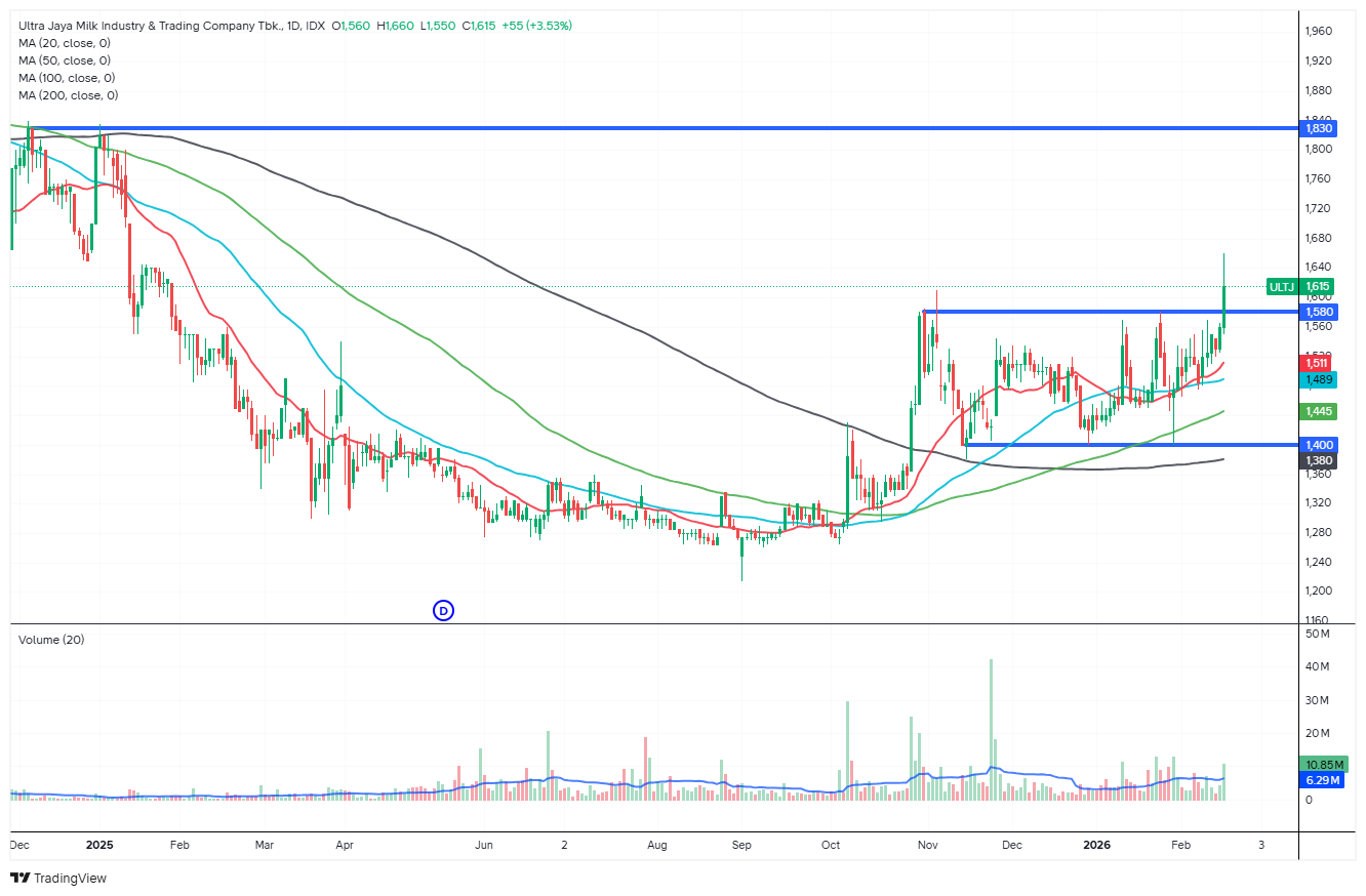 Pada perdagangan Rabu (18/2/2026), saham ULTJ berhasil breakout resistance ke atas 1600, jika tren naik berlanjut dan bisa mengubah resistance itu menjadi support selanjutnya, ada potensi dalam jangka menengah saham ULTJ bergerak naik menuju resistance selanjutnya di level 1800-an.