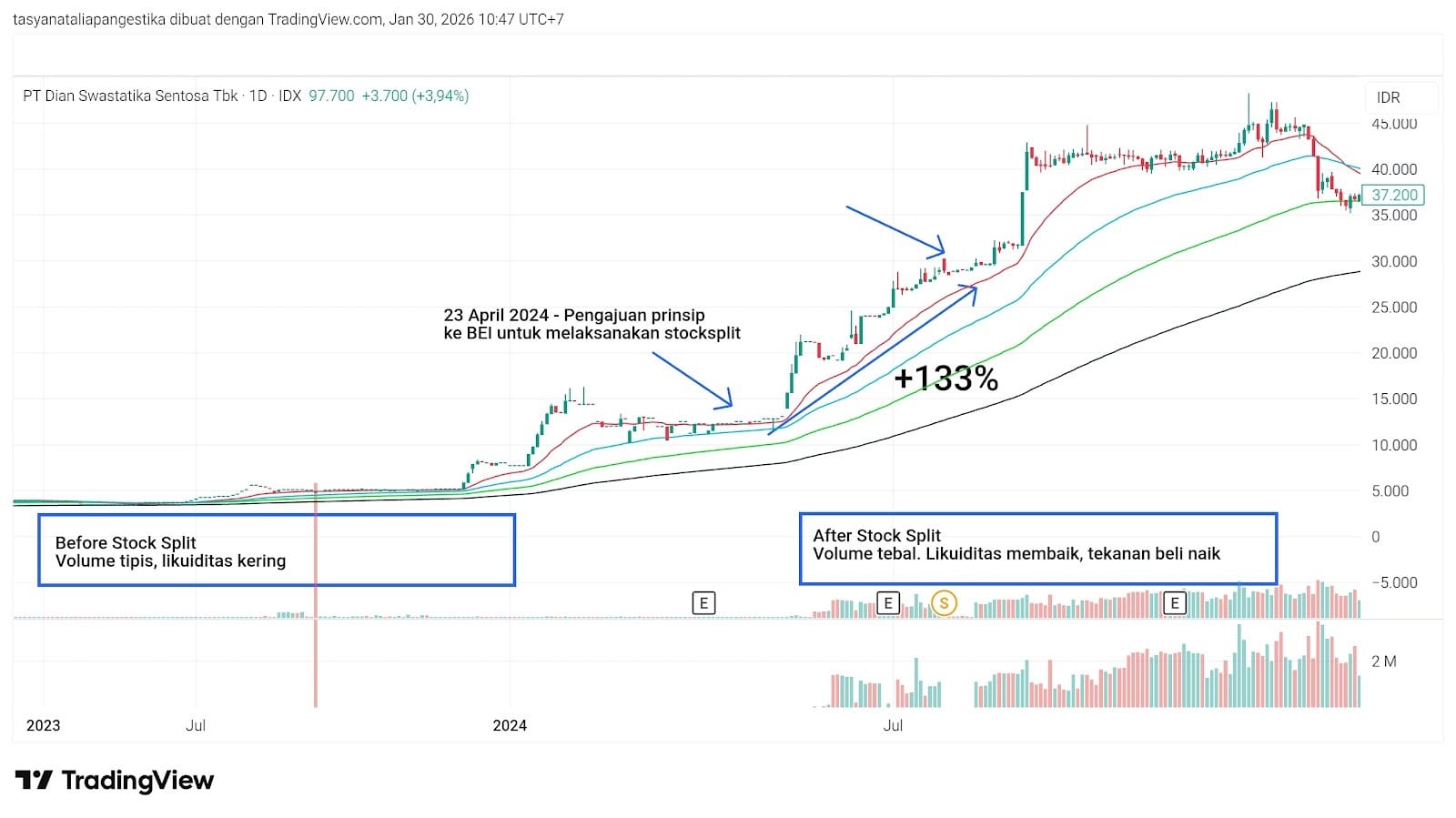 Menilai secara historis, penguatan saham DSSA karena isu stock split kemungkinan bisa saja terjadi, bahkan pada perdagangan hari ini (30/1/2026) sampai pukul 11.00 WIB merespon berita di pagi hari akan ada stock split, saham DSSA langsung naik kisaran 3,46% ke posisi Rp97.250 per saham.