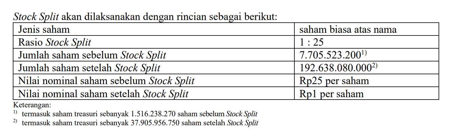 Jumlah saham yang beredar akan melonjak jadi 192,63 miliar lembar dari sebelumnya 7,75 miliar lembar. Nilai nominal dari Rp25 per saham, menyusut jadi Rp1 per saham.