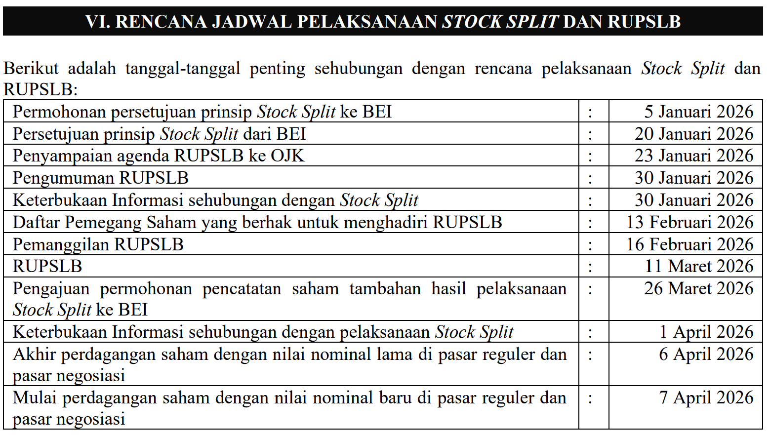 Adapun rencana stock split tersebut masih akan dimintakan persetujuan pemegang saham melalui Rapat Umum Pemegang Saham Luar Biasa (RUPSLB) yang dijadwalkan pada 11 Maret 2026. Jika disetujui berikut jadwal lengkap yang patut diperhatikan investor: