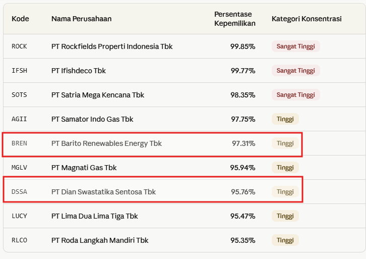 Sebelumnya, regulator sudah mengeluarkan daftar HSC pada 2 April lalu, hasilnya ada dua saham di konstituen MSCI terdeteksi punya konsentrasi tinggi yaitu saham BREN dan DSSA, masing-masing sampai 97 persen dan 95 persen.