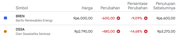 Saham DSSA langsung terpukul telak hampir 15 persen sejak pembukaan menuju posisi Rp2.790 per saham. Sementara saham BREN terjun 9 persenan ke posisi Rp6000 per saham.