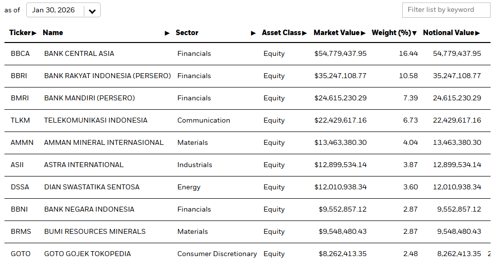 Terlihat sebagtai berikut saham BBCA, BBRI, dan BMRI secara berurutan menempati tiga teratas sebagai saham dengan porsi terbesar di MSCI Large Cap Indonesia, sementara BBNI berada di posisi ke-delapan dengan porsi 2,87 persen.