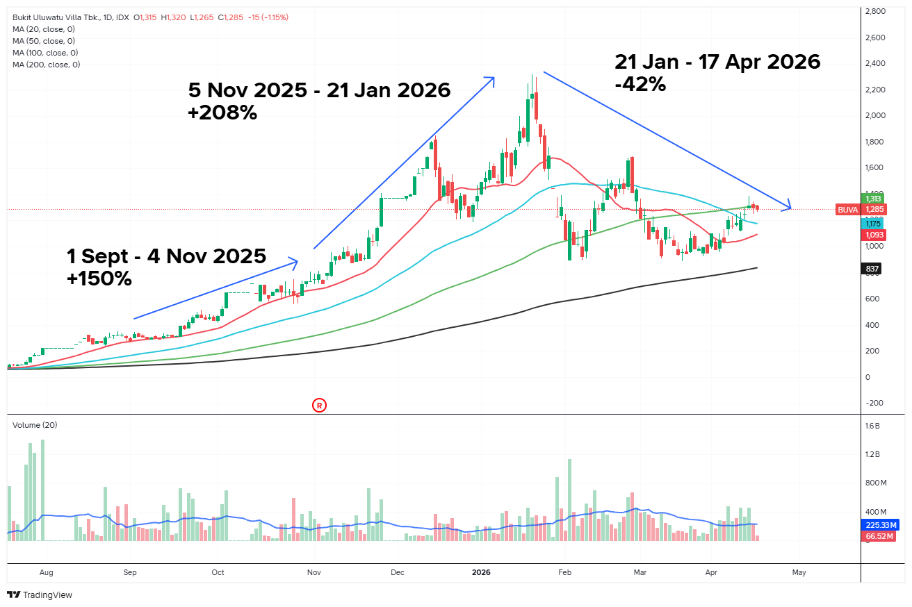 Namun setelah itu, realita mulai kembali bermain. Hingga saat ini, harga saham BUVA telah terkoreksi sekitar 42 persen dari level puncaknya.