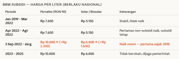 Setelah penyesuaian pada 2022, harga BBM bersubsidi seperti Biosolar dan Pertalite kembali stabil, masing-masing di Rp6.800 dan Rp10.000 per liter hingga saat ini.