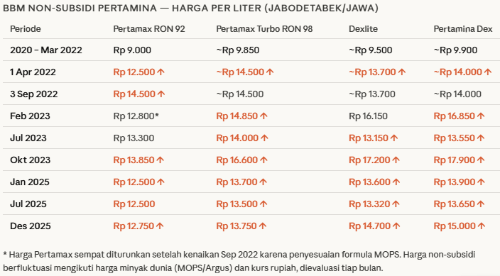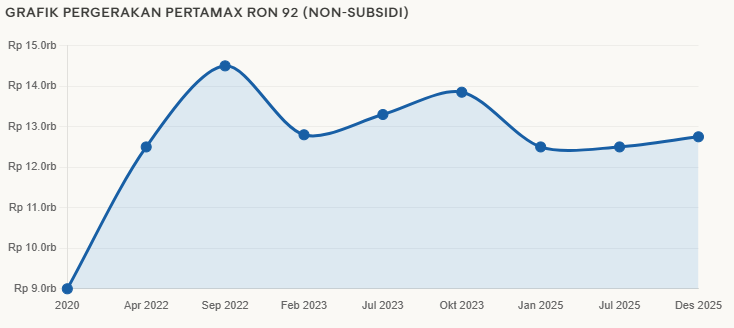 Salah satu momen kenaikan yang paling kencang terjadi pada April 2022, ketika harga Pertamax naik dari Rp9.000 menjadi sekitar Rp12.500–13.000 per liter, seiring lonjakan harga minyak global pasca invasi Rusia ke Ukraina.