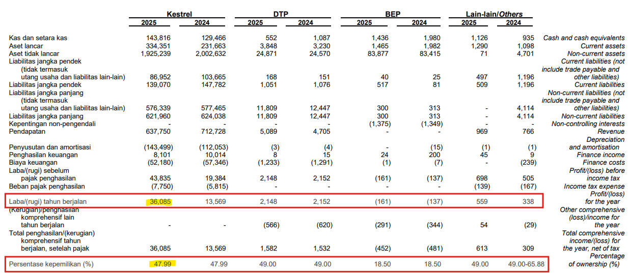 Kalau menilik dari laporan keuangan 2025, kontribusi Kestrel terhadap AADI sebenarnya relatif kecil jika dilihat dari skala konsolidasi, terhadap pendapatan sangat kecil (0,35%) karena dicatat menggunakan metode ekuitas, bukan sebagai revenue langsung.