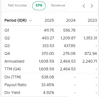 Namun, dari sisi timing patut diperhatikan. Dividen final dari tahun buku sebelumnya masih belum dibagikan, sehingga ada potensi pembagian terlebih dahulu setelah RUPS yang umumnya berlangsung sekitar bulan Mei, atau pada semester I 2026.