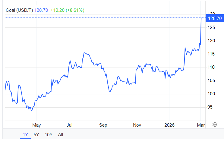 Harga batu bara melonjak lebih dari 8 persen dalam sehari hingga menembus US$128 per ton. Kenaikan ini dipicu oleh kekhawatiran pasokan yang makin ketat serta meningkatnya permintaan sebagai substitusi gas.