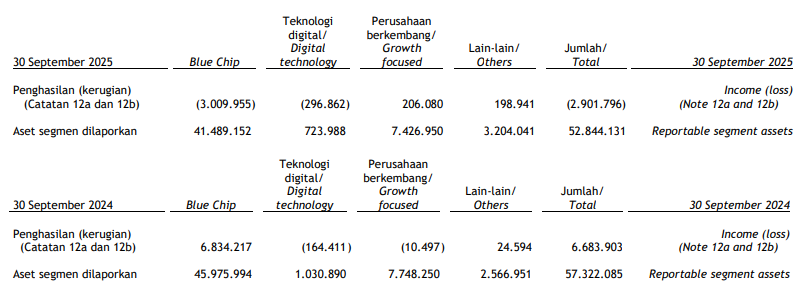 - Blue Chip mencatat rugi sekitar Rp3,0 triliun (vs laba Rp6,8 triliun di 9M24). Ini menunjukkan koreksi valuasi pada portofolio listed menjadi kontributor utama tekanan laba.
