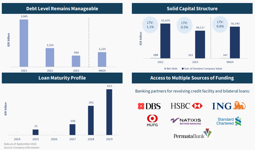 Net debt terakhir hanya berada di kisaran ratusan miliar rupiah, sementara nilai portofolio investasi mencapai puluhan triliun rupiah. Rasio loan to value tercatat di bawah 1 persen, level yang sangat rendah untuk perusahaan investasi.