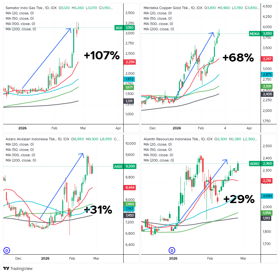 Kami menarik data sejak 2 Januari - 24 Februari 2026, beberapa saham dalam porto SRTG yang terbang ada MDKA sampai 68 persen, ADRO-AADI kisaran 30 persen, dan ada saham growth AGII yang melonjak paling moncer di atas 100 persen dari awal tahun.