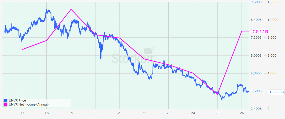 Justru, pada 2018 itu menjadi peak dari harga saham UNVR yang sempat mencapai level tertinggi secara intraday pada Rp11.625 per saham. Setelah itu, saham UNVR downtrend lebih dari lima tahun sampai saat ini.