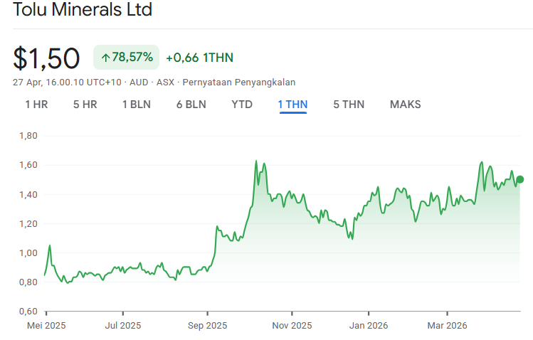 Harga itu sebenarnya masih cukup premium sekitar 7,4 persen dari saham Tolu Minerals Limited, dengan kode saham TOK di bursa saham Australia (ASX) sampai perdagangan 27 April 2026 yang berada di AUD 1,50 per saham.