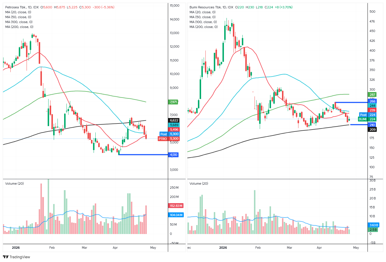Dari sisi teknikal, untuk pergerakan saham PTRO saat ini sedang menguji area support di MA20 harian. Namun, level ini masih tergolong rawan ditembus karena tekanan jual yang terlihat dari volume masih cukup tinggi. Jika pelemahan berlanjut, area support berikutnya berada di kisaran 4.130.