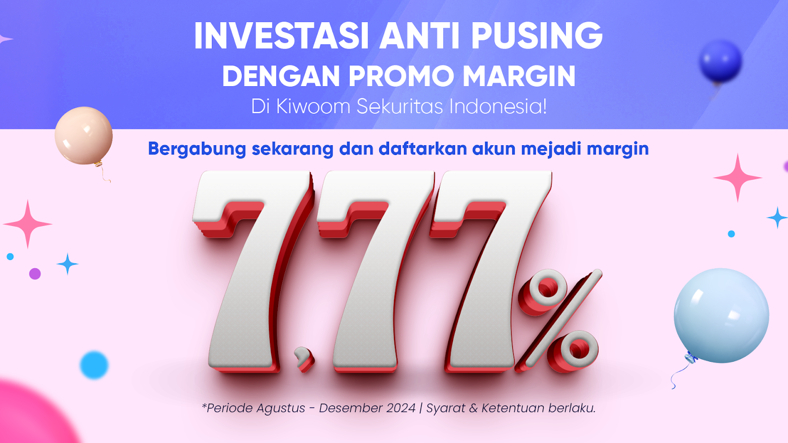 Ketiga, Kiwoom Sekuritas juga lagi ada spesial promo Margin Trading dengan bunga SUPER RINGAN cuma 7,77 persen per tahun atau hanya 0,02 persen per hari hingga 31 Desember 2024.