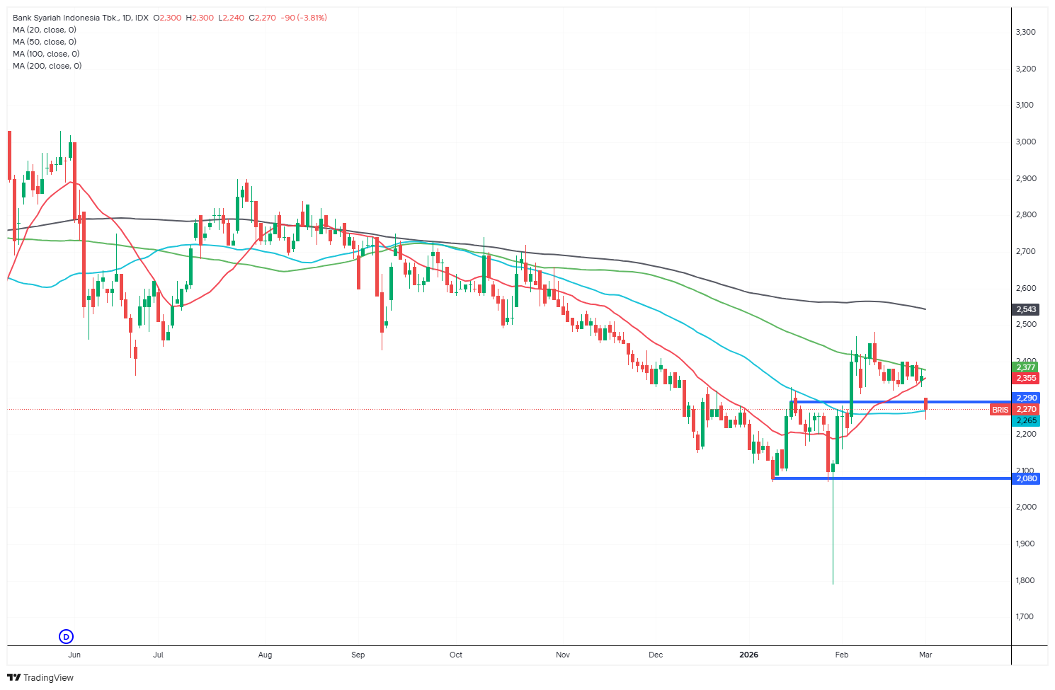 Secara teknikal, saham BRIS pada 2 Maret 2026 mengalami tekanan berat dengan koreksi tiga persen lebih. Kami nilai, pergerakannya akan cenderung aman selama tidak lanjut turun ke bawah area 2000 lagi.